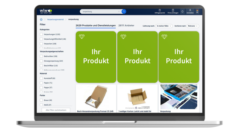 Mit Boosted Products, unserem Produkt- und Dienstleistungs-Boosting, verbessern wir Ihr Portfolio-Ranking in den Suchergebnissen auf wer liefert was (wlw). So steigern Sie Ihre Sichtbarkeit und gewinnen qualifizierte Leads.