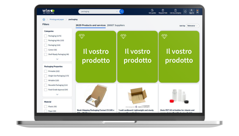 Con Boosted Products, il nostro servizio di potenziamento per prodotti e servizi, miglioriamo il posizionamento del tuo portafoglio nei risultati di ricerca su wlw, aumentando così la tua visibilità e permettendoti di acquisire lead qualificati.